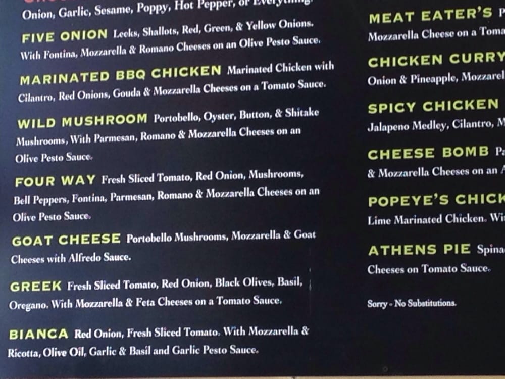Fresh sliced tomato, red onion, mushrooms, bell peppers. Fontina, parmesan, Romano and mozzarella cheeses on an olive pesto sauce.